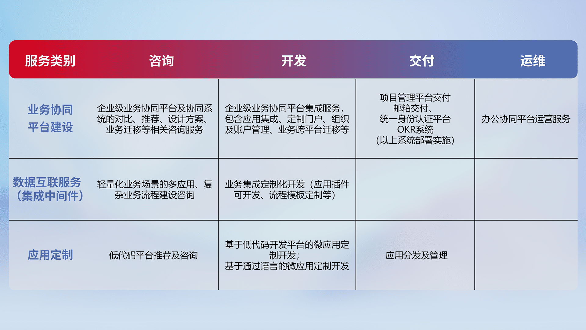 针对钉钉、、企微、、、、IDaas等平台级产品提供产品的规划、、、方案、、交付、、、定制化开发等服务,,,实现如统一协同办公、、、智能客户服务、、混合会议管理、、智能数据查询、、、等业务场景,,,实现数字化转型。。。
