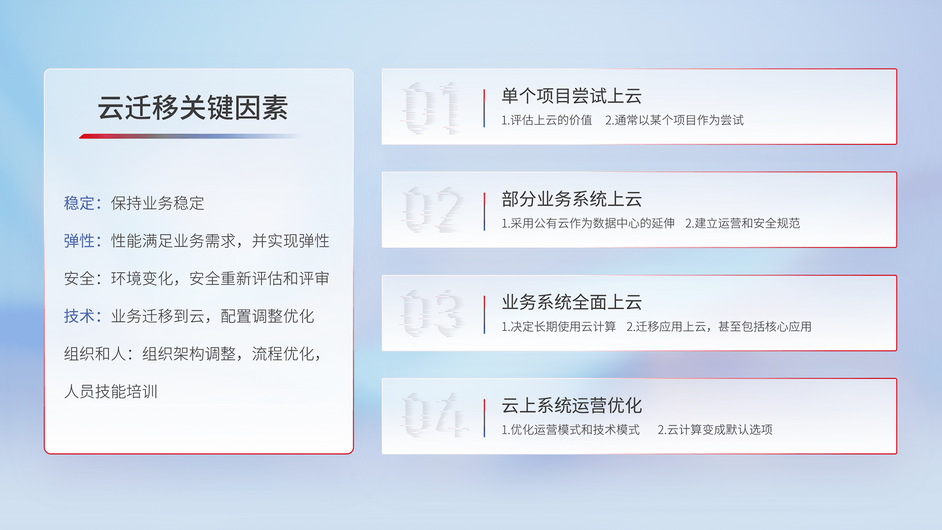 结合实际业务,,,从规划设计、、云平台选型、、、云原生改造、、、数据迁移、、集成交付,,迁移全过程为客户识别最佳上云路径,,,做好风险识别管理,,设计网络架构、、、身份权限、、安全审计合规、、、、操作审计、、日志审计、、监控告警策略、、多站点容灾设计等,,对云上基础设施进行整体规划,,,,提升IT治理水平,,,以满足弹性、、高可用、、、高性能的需求。。。。