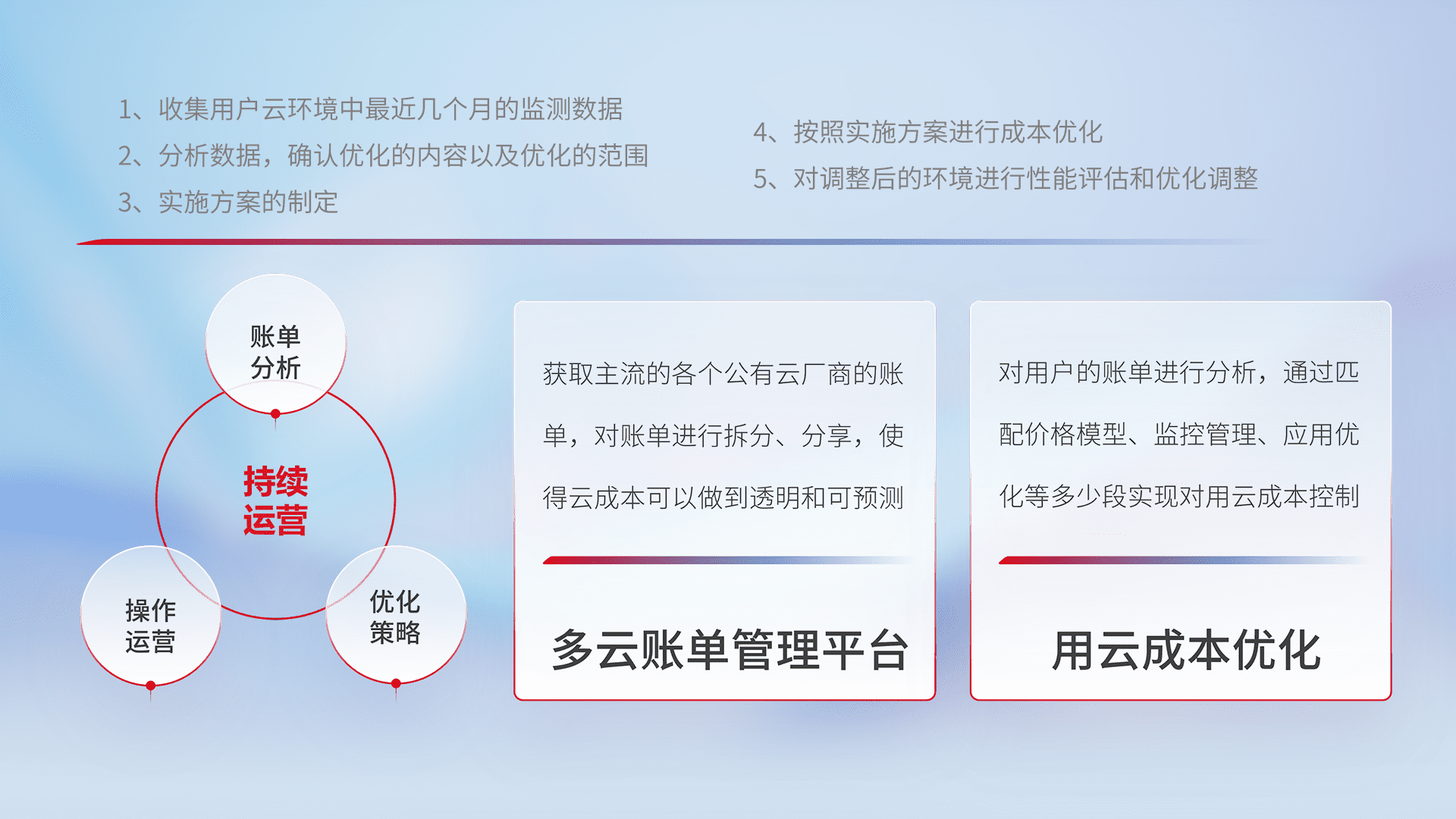 通过多云纳管,,,,以统一的资源数据模型把客户的云资源进行抽象和封装,,,进而实现对多云资源的统一操作,,保障云资源管理的可靠性、、、、稳定性与可用性。。。量身定制化运维内容,,配置、、、开发运维、、补丁管理、、、备份、、、、监控、、认证和访问管理、、、、审计和日常巡检等,,,保障在用云过程中的可靠度,,,稳定度以及高可用率。。。。